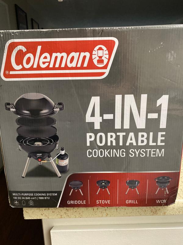 The Coleman 4-IN-1 Portable Cooking System is a versatile outdoor cooking solution that features 4 interchangeable cooking surfaces to prepare different types of foods while you are away from home. Wow friends and family with a variety of outdoor meals when you travel with the Coleman 4-in-1 Portable Propane Gas Camping Stove. It features 3 interchangeable cooktop inserts stove wok and reversible griddlegrill so you can effortlessly prepare breakfast lunch or dinner on one very portable space-saving outdoor cooking solution.